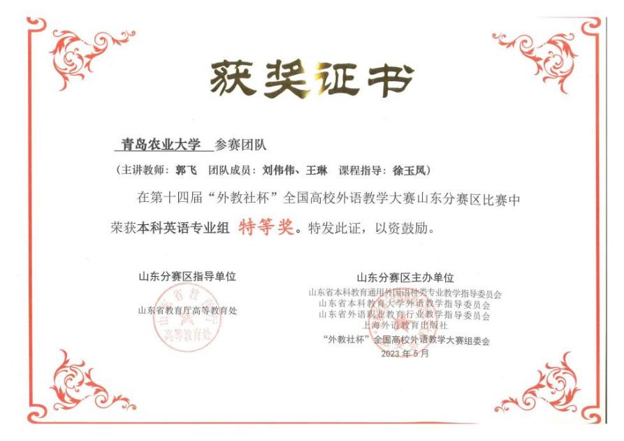学院开展教学研讨和“教师工作坊”等活动,鼓励教师积极参加各类教学技能比赛,学院教学及人才培养工作成绩显著。近五年,学院荣获省级教学成果奖3项,青岛社科优秀成果奖、高校优秀科研成果奖15项。《大学英语》《中国农业文化概览》两门课程获批省一流本科课程。学院共36人次获得国家级、省级教学比赛奖项,其中郭飞团队荣获“外教社杯”全国高校外语教学大赛山东赛区特等奖,是学院教师参加此项比赛取得的最好成绩。38人获得校“青年教学能手”“最美教师”“最受欢迎本科任课教师”等荣誉称号。