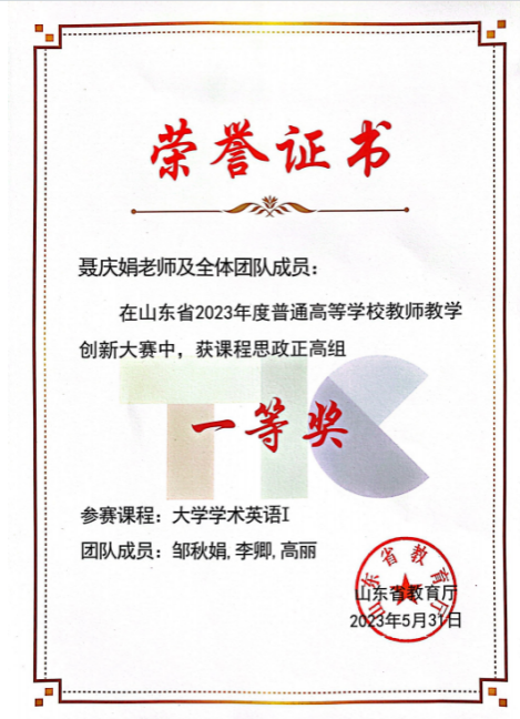学院建立了“三维六度”课程思政立体化育人体系,申请课程思政教研课题24项,发表课程思政教研论文11篇。2位教师获山东省本科高校黄河重大国家战略课程思政优秀案例,13位教师在“全国高校外语课程思政教学案例大赛”、“第三届智慧树杯课程思政示范案例教学大赛”等比赛中获得省级奖项。4门课程获评校级课程思政示范课,《中国农业文化概览》获批山东省课程思政示范课程。聂庆娟团队获山东省2023年度普通高等学校教师教学创新大赛课程思政赛道正高组一等奖,实现了学院在此项赛事上的新突破。