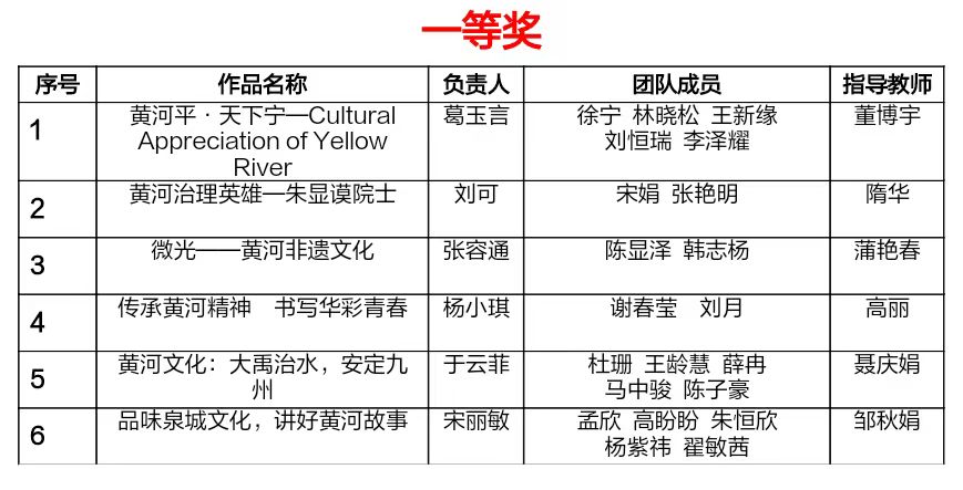 青岛农业大学第三届大学生英语创新大赛•英语微视频创作大赛(黄河文化专题)自5月份启动以来,吸引了全校18个学院共计287名学生参加,59支队伍提交参赛作品。经过网络投票和专家评审,共评选出一等奖6项,二等奖12项,三等奖17项;最佳导演奖1项,最佳组织奖2项,最佳人气奖2项,最佳编剧奖2项,最佳创意奖3项。现将获奖名单公布如下: