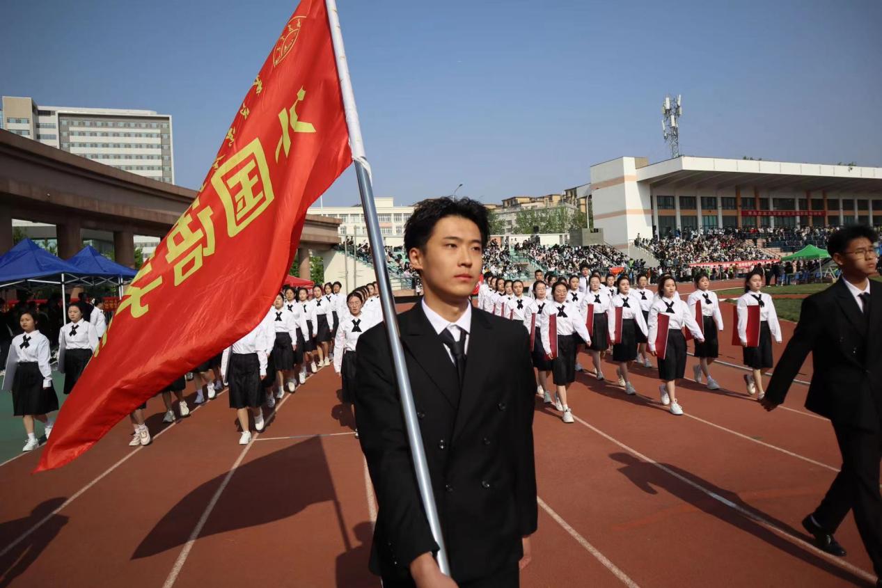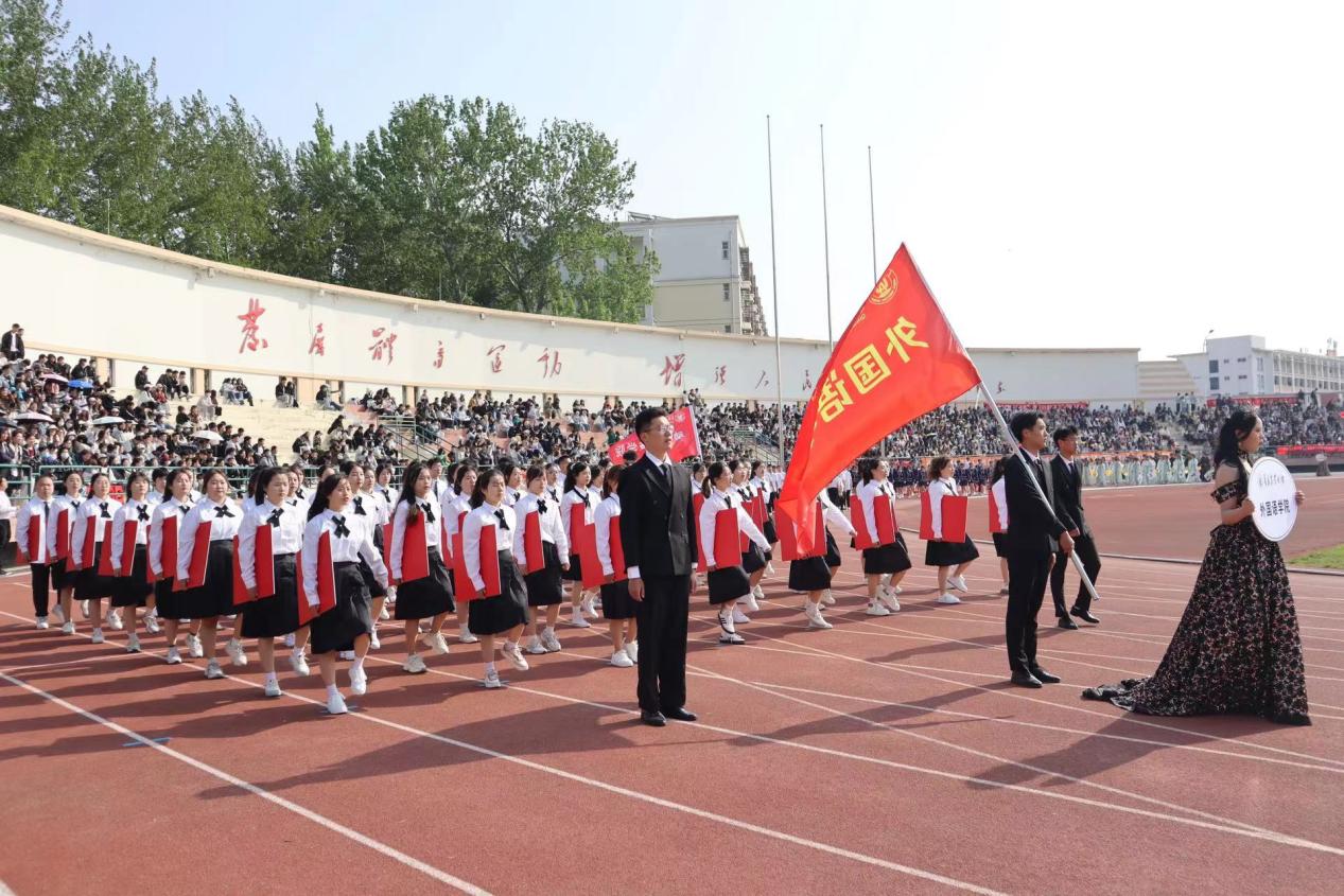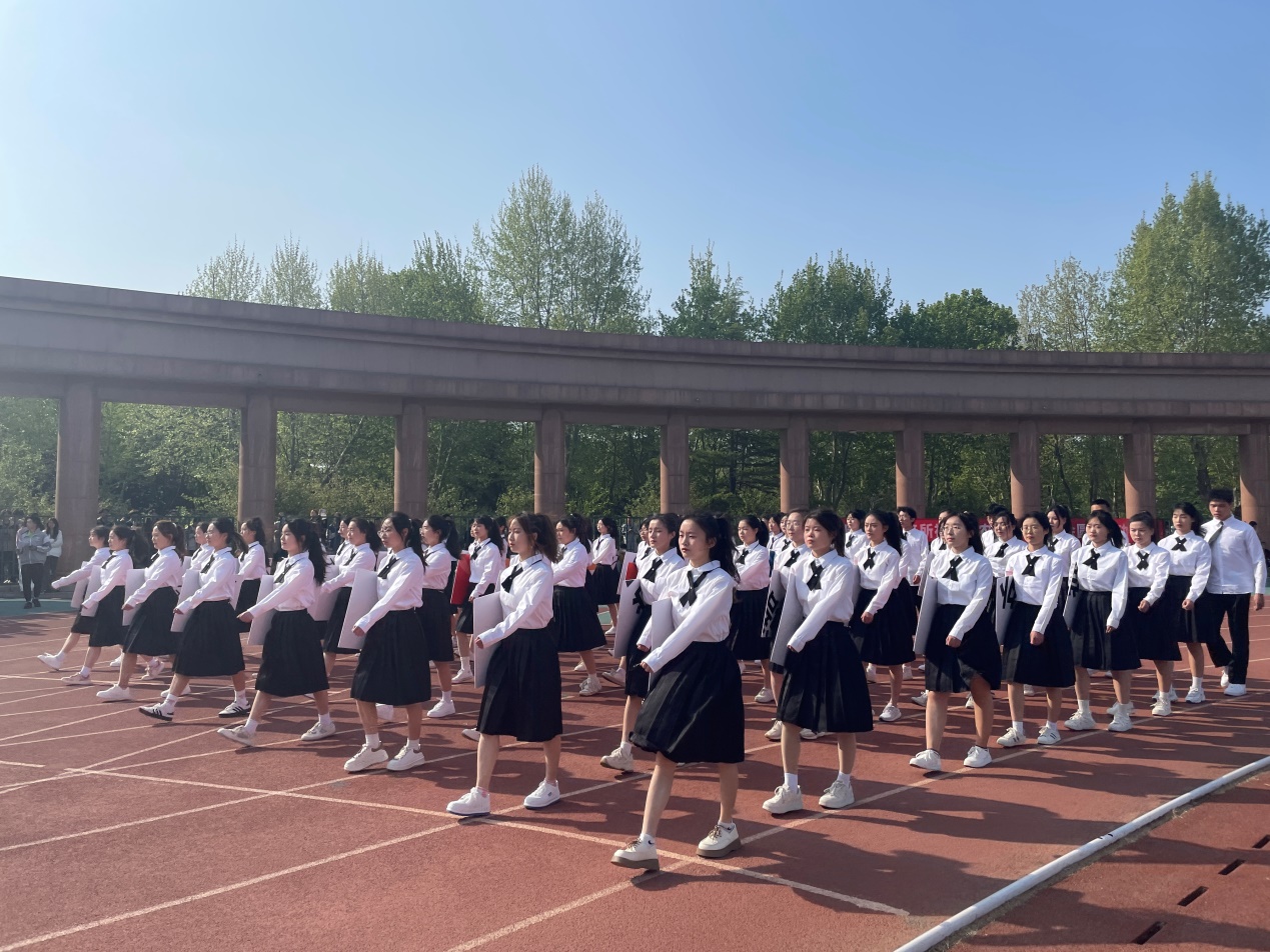 开幕式上,3868银河总站学生代表方队大放异彩。方队行进间,身穿黑白相间学院风制服的学子们步伐整齐,精神昂扬,展现出学院青春向上的良好风貌。期间,“奋勇拼搏 逐梦中华”的嘹亮口号彰显了外院学子一心向党、与祖国发展同频共振的情怀。在行至主席台前时,方队随着音乐节奏进行队形变换,用纸板拼凑起的“I LOVE QAU”字样令人眼前一亮;随之喊出的“博外之长,共语辉煌,青春无畏,外语飞扬”的口号,更是学院学子立志用外语讲好中国故事,传播好中国声音的最佳写照。