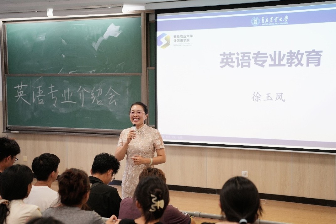 徐玉凤介绍了英语专业的发展、英语系的教师和优秀的师兄师姐,鼓励英语系新生在这个新的起点加油前行,有情怀、有干劲,披荆斩棘、不负青春,同时,给学生提出了专业学习建议。