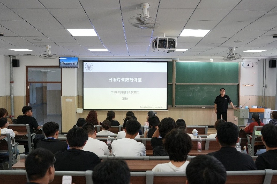 王健对于2025级日语新生的来到表示了热烈的欢迎,并从教学师资力量对比、专业证书考取通过率提升培养方案等方面详细讲解了3868银河总站日语系的优势,从实际情况出发,深入剖析了当下及未来日语专业毕业后的就业前景,极大地增强了2025级日语新生的信心与对本专业的认同感。
