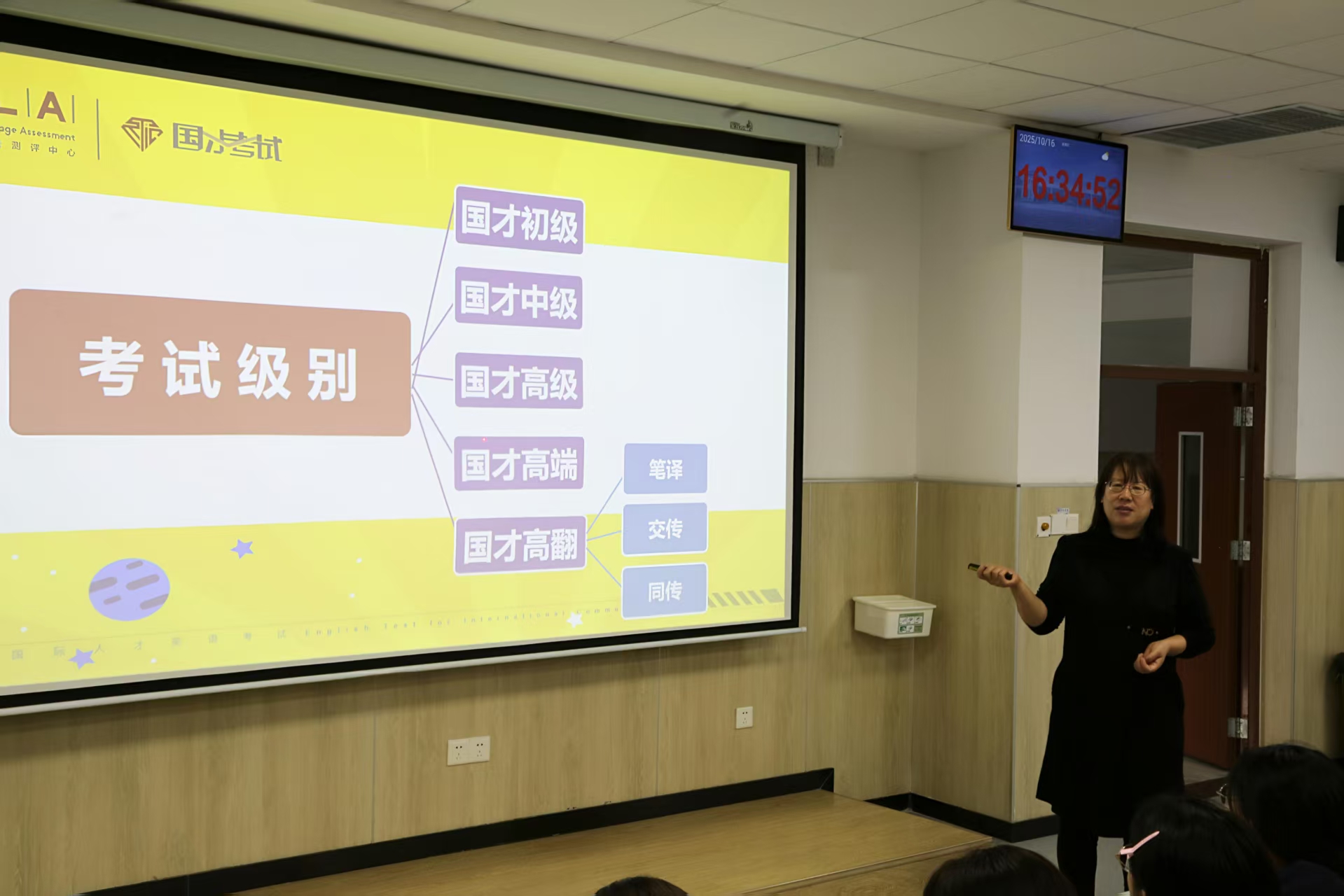 10月16日,3868银河总站在平度校区博学楼A301举办“语言筑梦,国才领航”国才考试宣讲会,会议由英语系副主任左燕茹主讲,3868银河总站2025级英语专业全体学生参加。