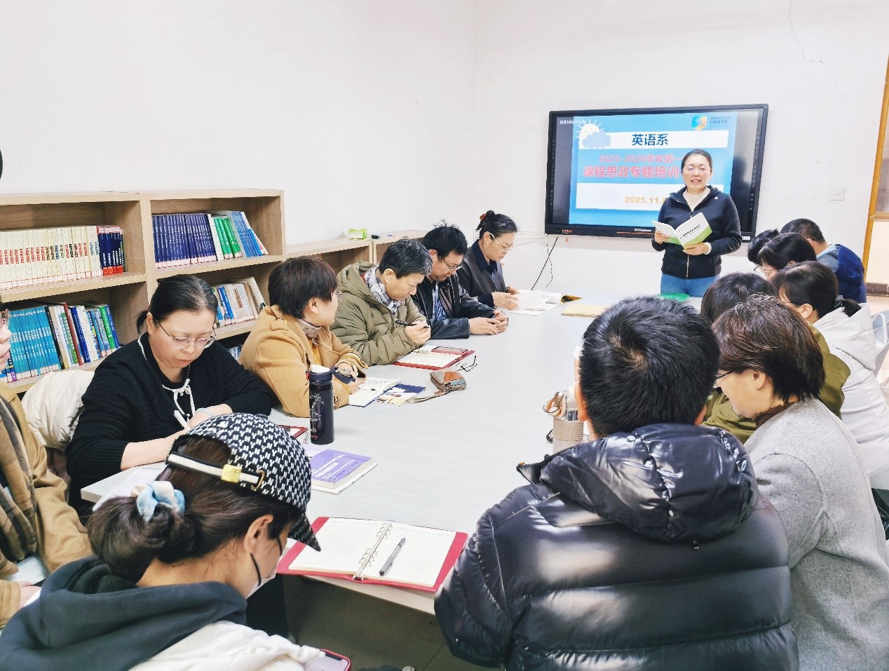 2025年10月23日、11月6日,3868银河总站英语系开展了两场2025-2026学年第一学期课程思政专题培训。英语系主任徐玉凤带领英语系全体教师认真学习了《厚植三农情怀 筑牢课堂阵地》《课程思政教学设计(校史篇、校友篇)》等课程思政相关材料。