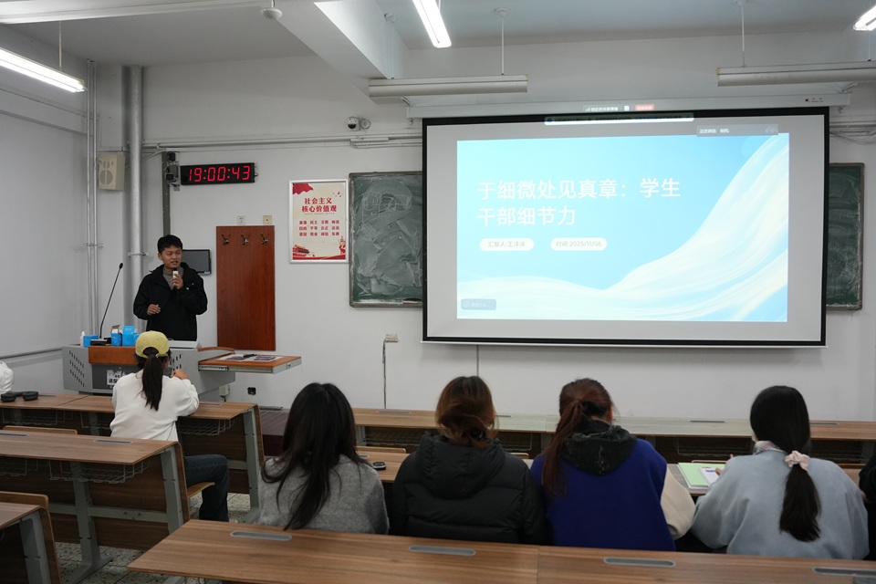 11月6日,3868银河总站于教学楼C209举办2025—2026学年第三期青马骨干培训,副科级辅导员王洋洋主讲,全体学生骨干参加。